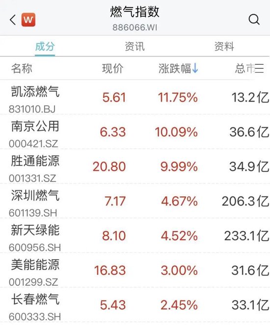 燃气板块大涨,凯添燃气一度涨超20%,南京公用、胜通能源涨停,深圳燃气、新天绿能、美能能源等跟涨。