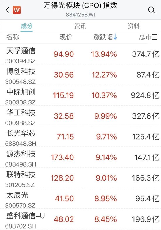 AI应用题材爆发,CPO概念股持续拉升,天孚通信、博创科技、中际旭创涨超10%,华工科技涨停,长光华芯、联特科技、太辰光等大涨。