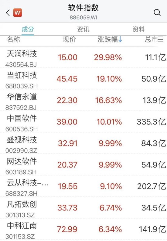 软件相关概念股同样上涨,天润科技连续两日30cm涨停,当虹科技、华信永道涨超16%,中国软件、盛视科技、网达软件涨停。