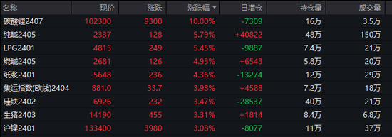 国内商品期市午盘大面积飘红,碳酸锂期货各期限合约连续第二日全线涨停,纯碱期货主力合约涨超5%。