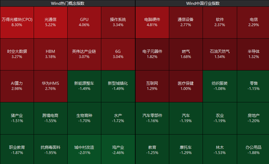 板块上来看,AI应用题材爆发,CPO、软件、算力等板块涨幅居前,燃气、半导体、互联网等表现活跃;而房地产、农业、汽车零部件板块走弱。